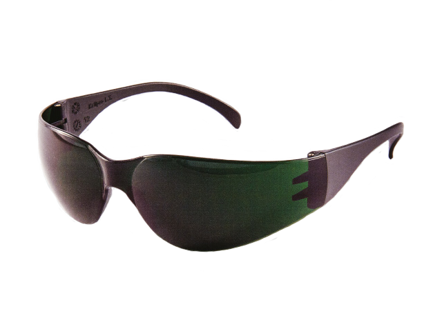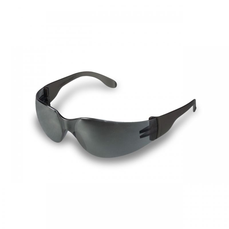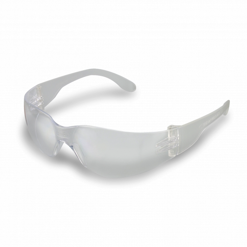 Óculos de proteção, com armação e visor confeccionados em uma única peça de policarbonato com revestimento externo de filme, com ponte e apoio nasal injetado na mesma peça e hastes tipo espátula.
