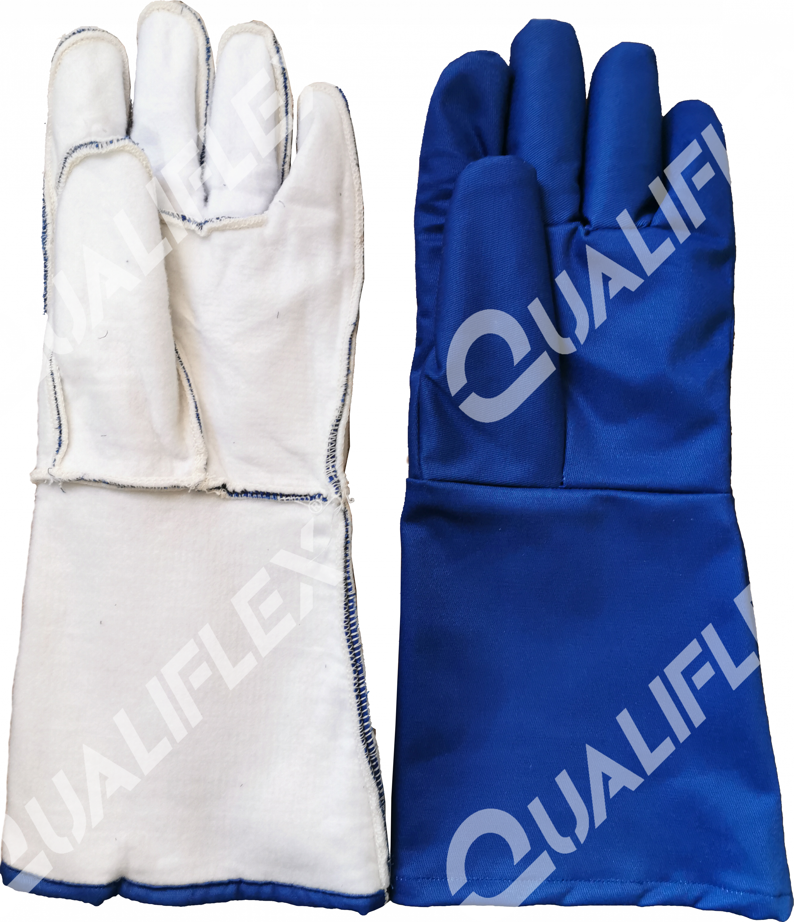 Luva confeccionada em tecido de algodão com tratamento impermeabilizante atóxico e retardante a chamas, forro removível de feltro térmico e brim, costurada com linha de aramida antichamas, comprimento total de 45cm.