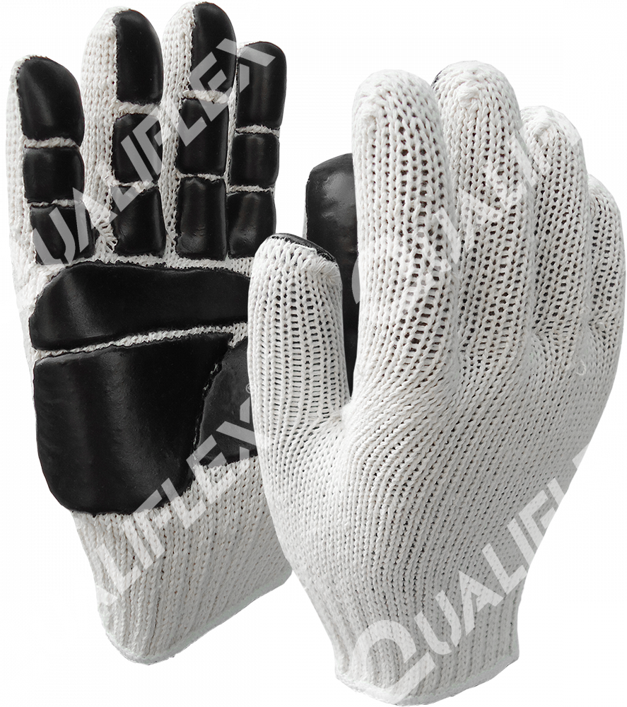 Luva tricotada em 4 fios de algodão branco com aplicação de placas antiderrapantes de tatex na palma.