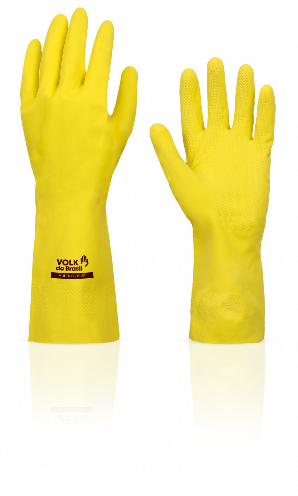 Luva de segurança confeccionada em látex natural, revestimento interno em flocos de algodão e relevo antiderrapante na palma e ponta dos dedos.