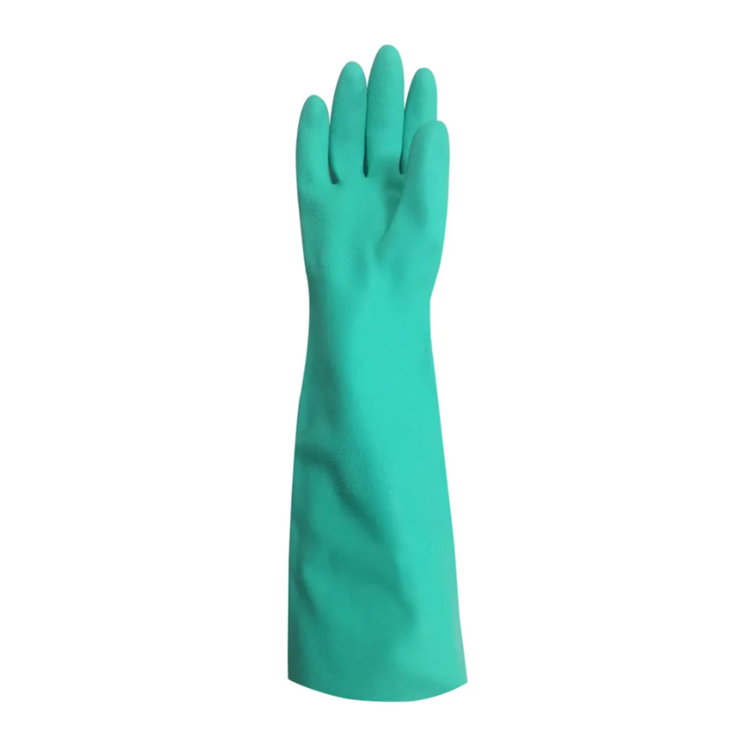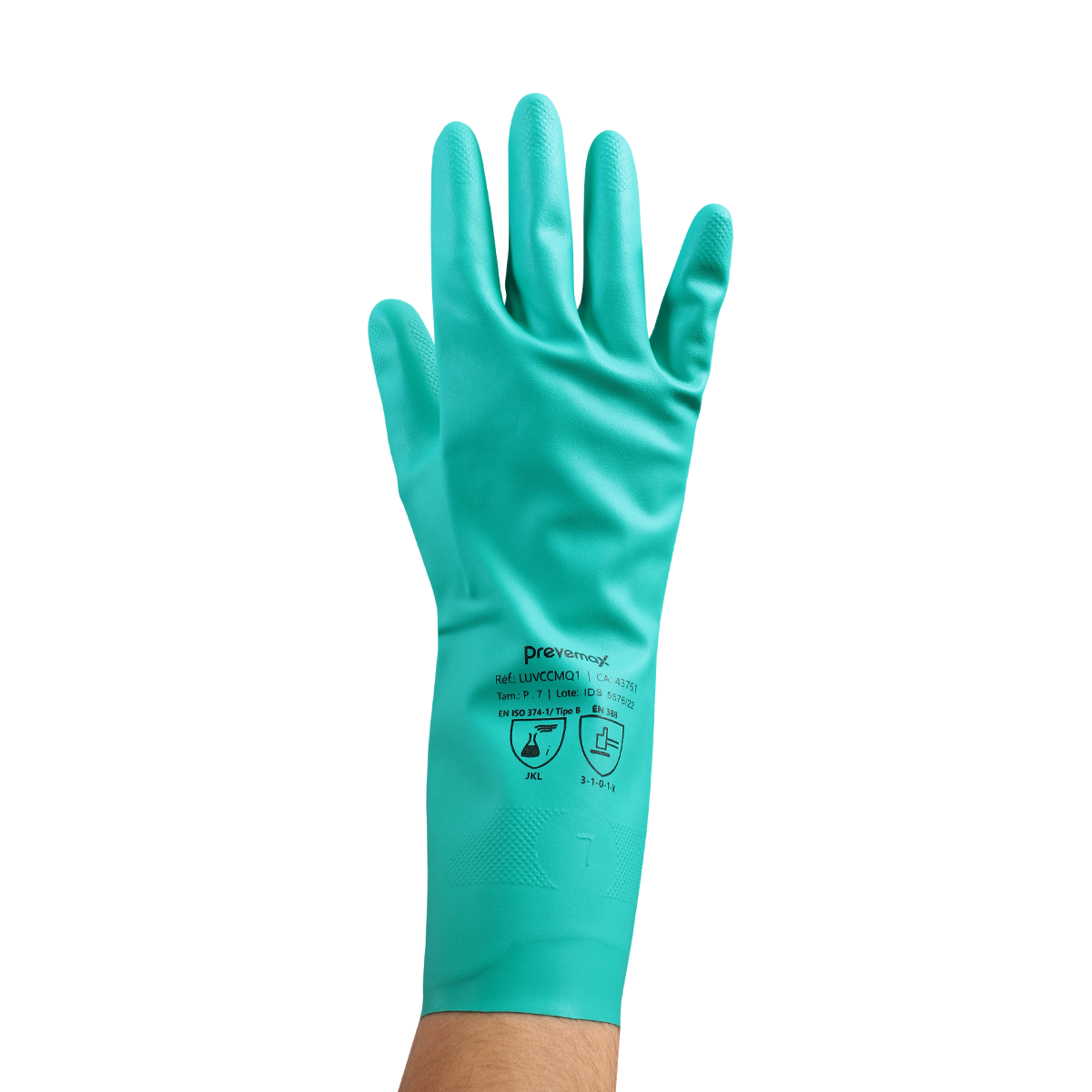 Luva de segurança confeccionada em borracha nitrílica, sem revestimento interno, antiderrapante na palma, face palmar dos dedos e ponta dos dedos, punho reto.