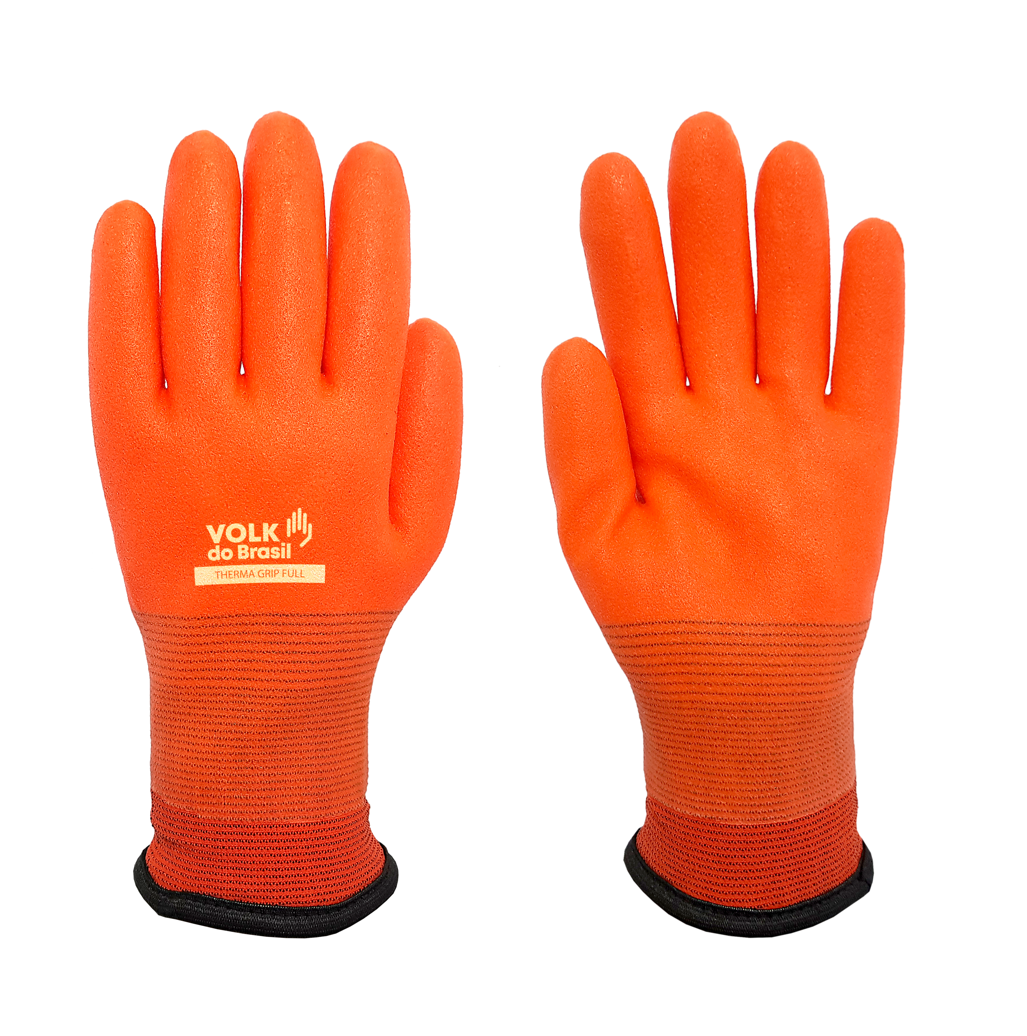 Luva de segurança confeccionada em uma camada interna de fibras acrílicas tipo terry e uma segunda camada de fibras sintéticas, totalmente revestida em policloreto de vinila na face palmar, pontas dos dedos e dorso, punho com inserção de fibras elásticas e acabamento em fibras sintéticas.