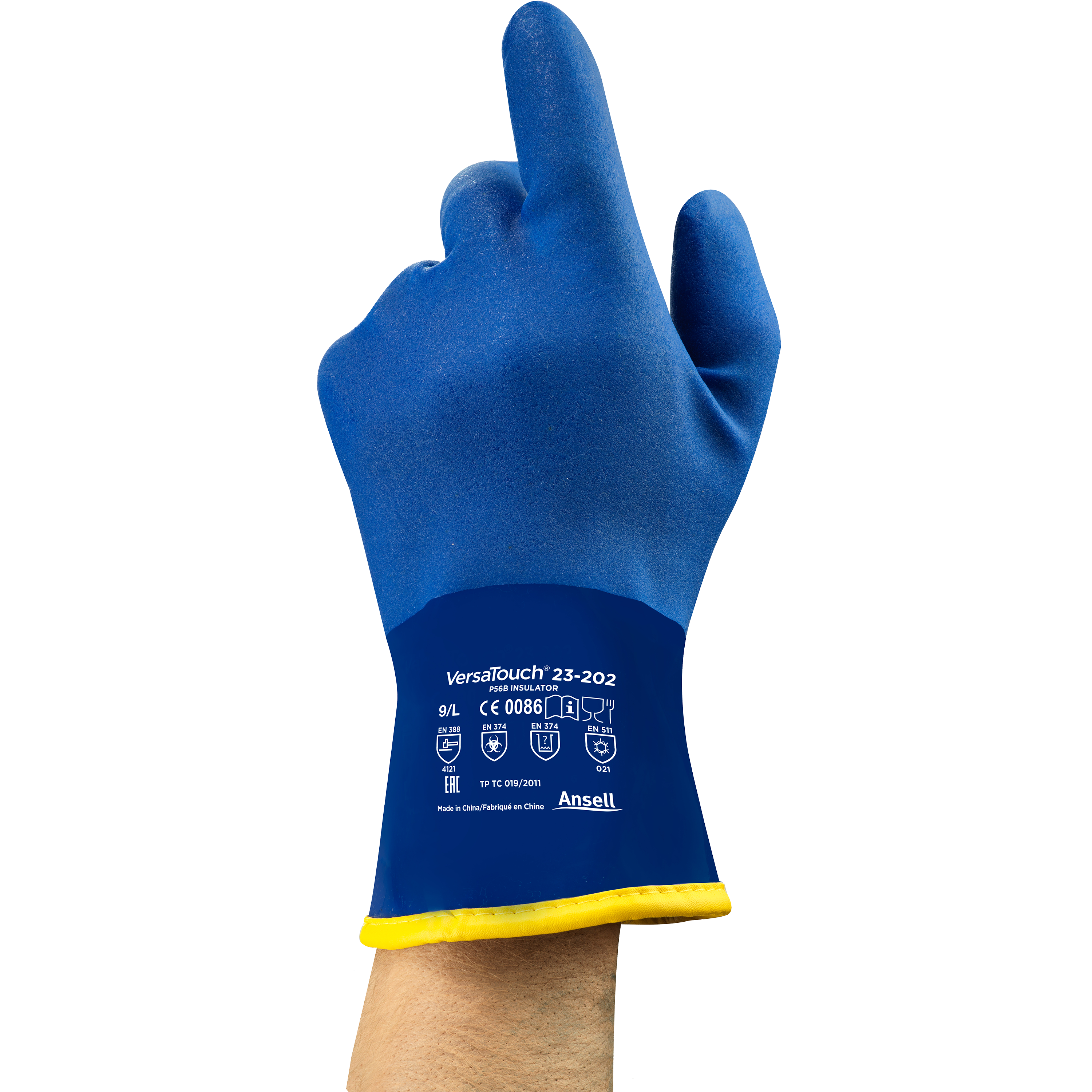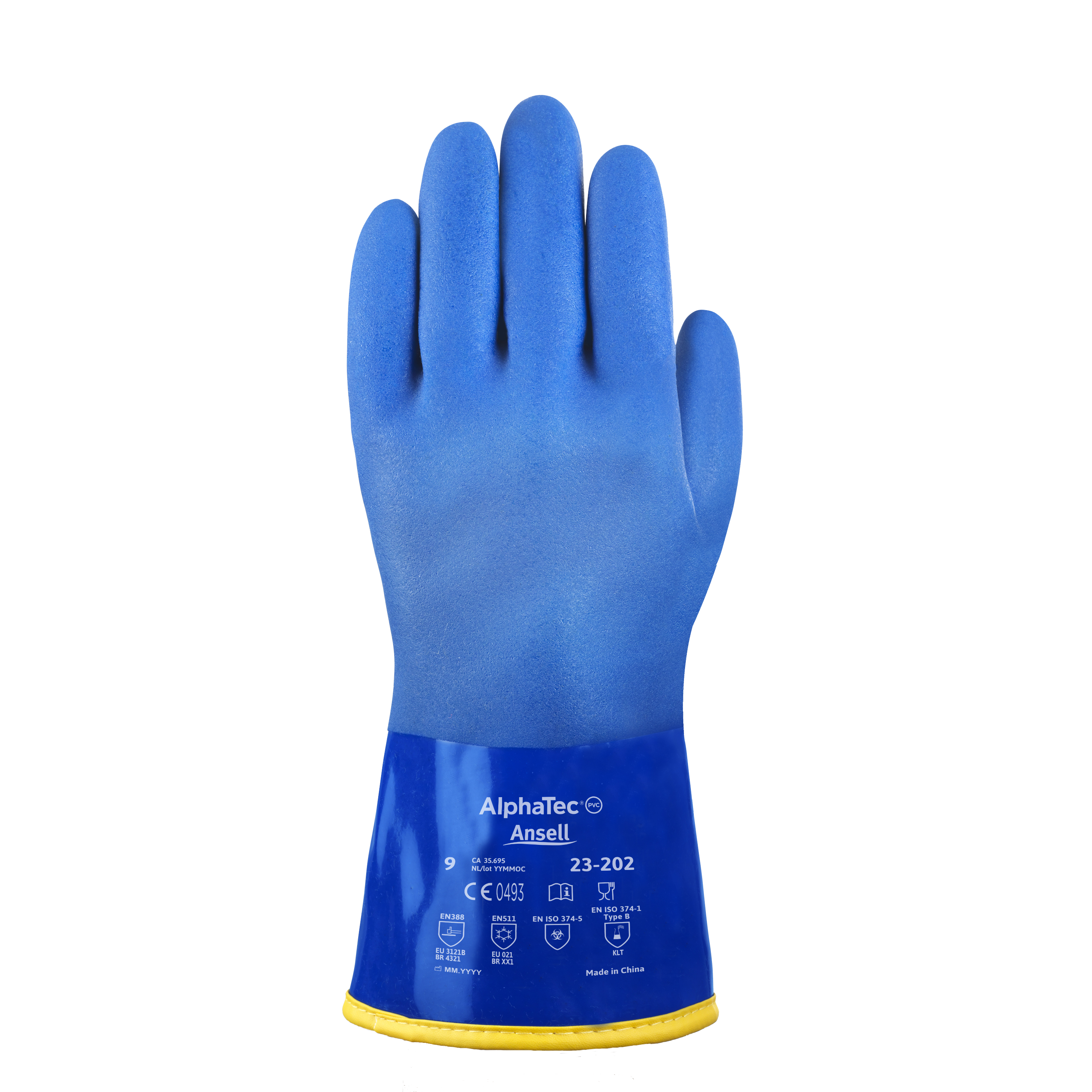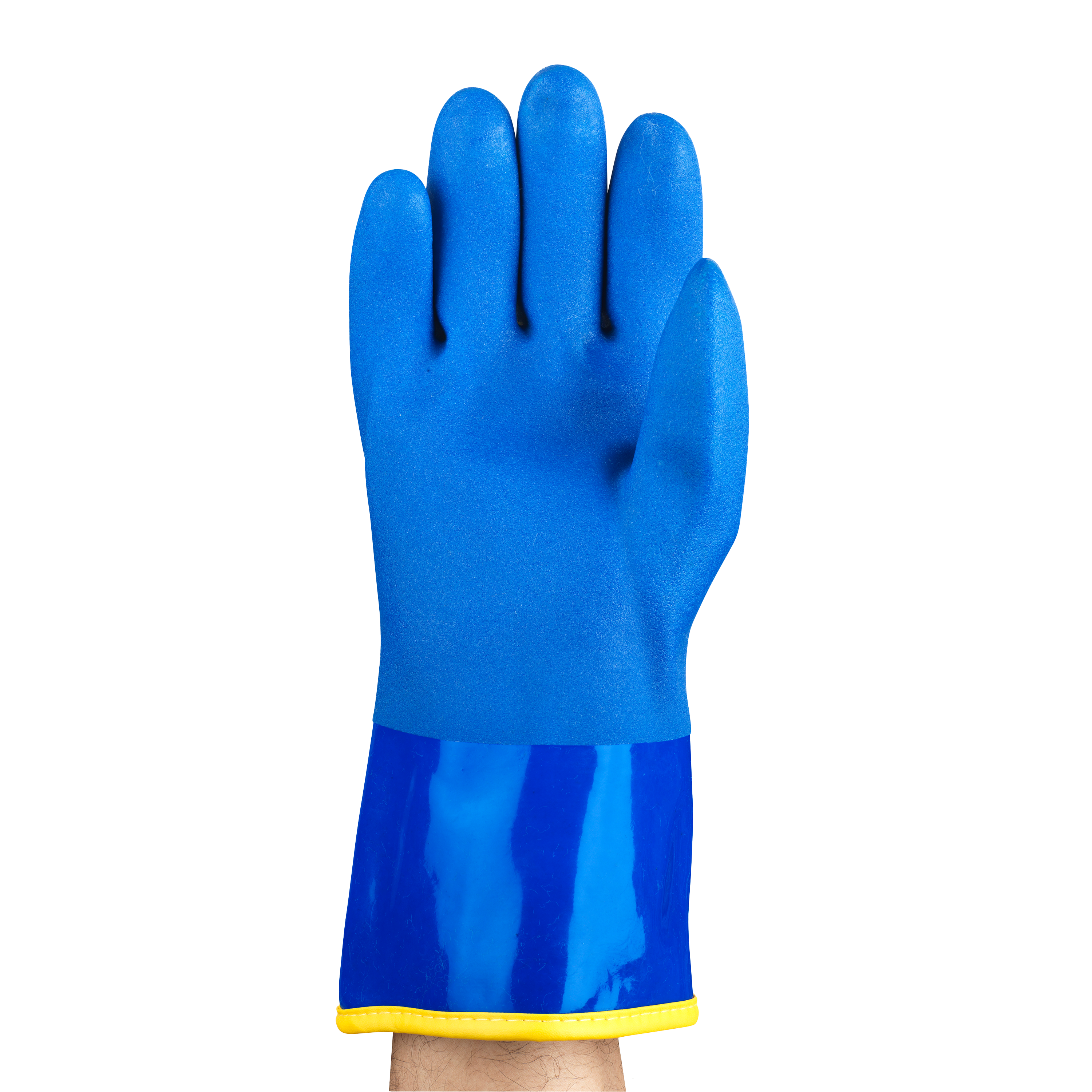 Luva térmica fabricada em PVC super premium Ansell, 100% impermeável, acabamento granulado antiderrapante, forro interno em acrílico polar sem costuras, punho aberto, comprimento de 30cm.