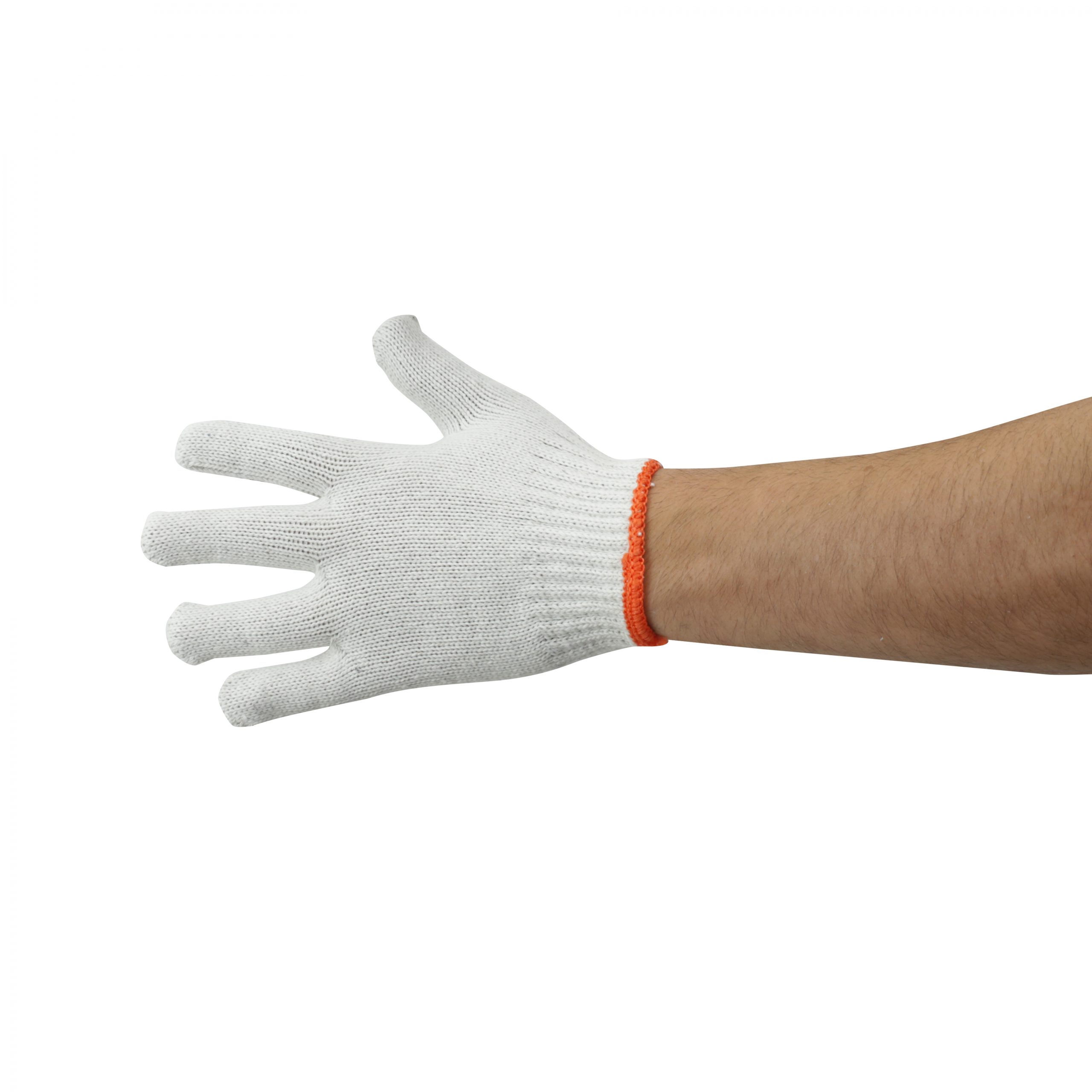 Luva de proteção, tricotada sem costura, confeccionada em fibras naturais e fibras sintéticas, punho com inserções de fibra elástica, acabamento final de fibras sintéticas sem pigmento.