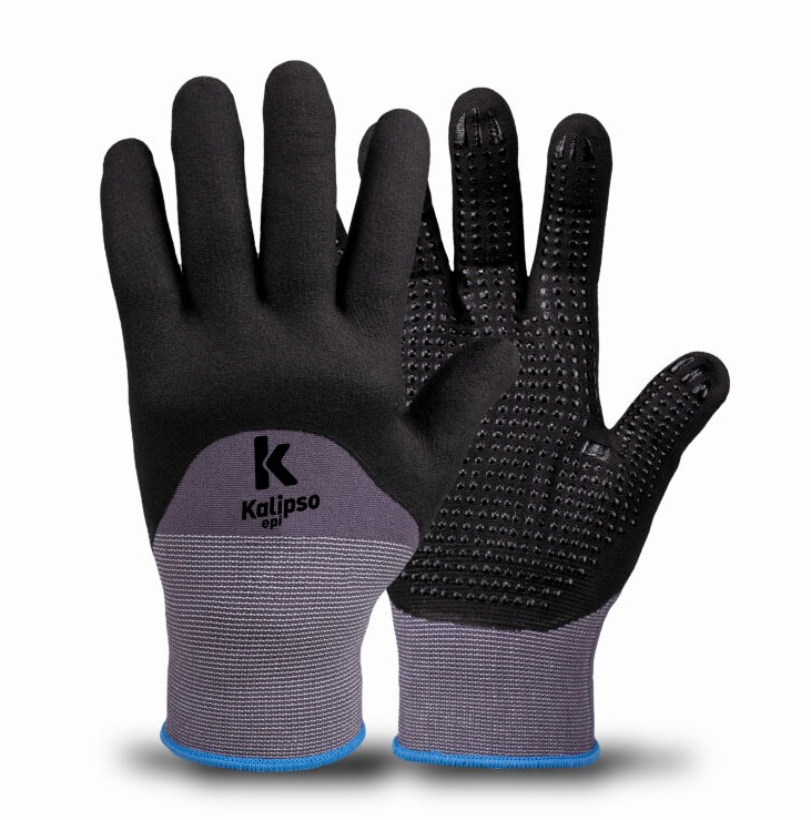 Luva de proteção, tricotada em nylon e elastano, revestimento em nitrílico micro foam, pigmentação antiderrapante de PVC na face palmar.