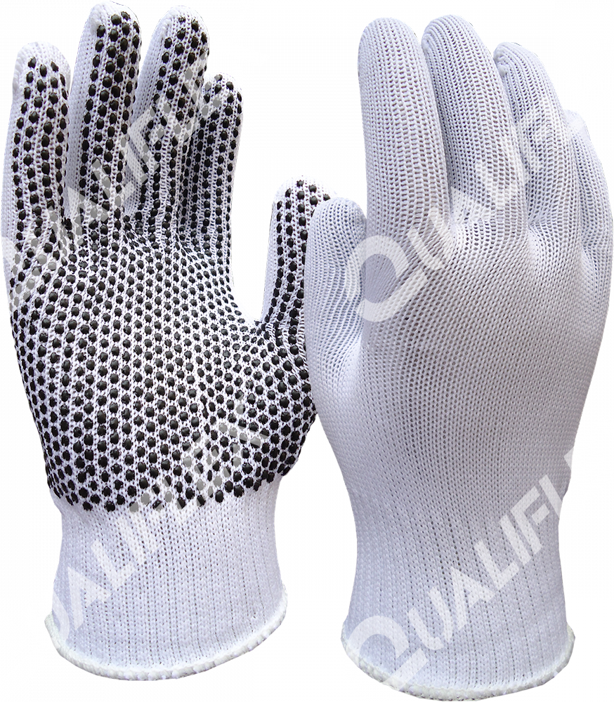 Luva tricotada em fios de helanca com pigmentação antiderrapante de PVC na face palmar.