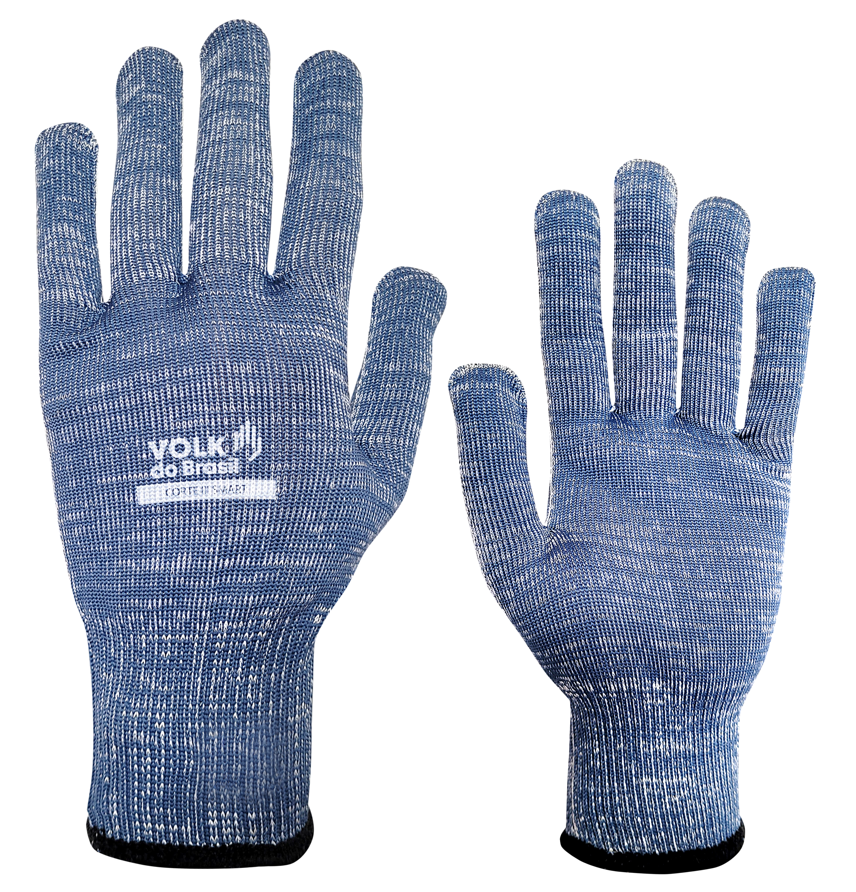 Luva de segurança confeccionada em fibras térmicas, HPPE (polietileto de alta densidade) e fios de aço inox, punho com inserção de fibras elásticas e acabamento em fibras sintéticas.