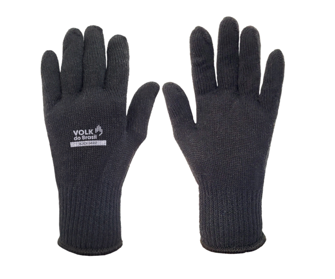 Luva de segurança confeccionada em fibras sintéticas (poliéster) e fibras naturais, punho com inserção de fibras elásticas, acabamento em fibras sintéticas.