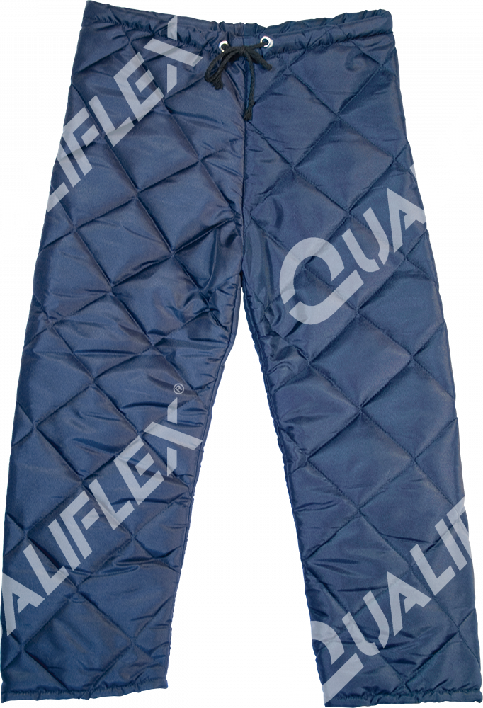 Calça térmica confeccionada em nylon resinado, manta térmica interna de poliéster de 200g/m², acabamento externo e interno matelado (costurado) em losangos de 10x10cm, fechamento através de cordão de algodão preto na cintura.