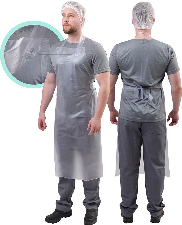 Avental de segurança, confeccionado em Policloreto de vinila sem componentes metálicos.