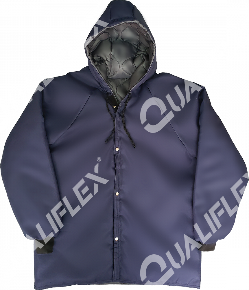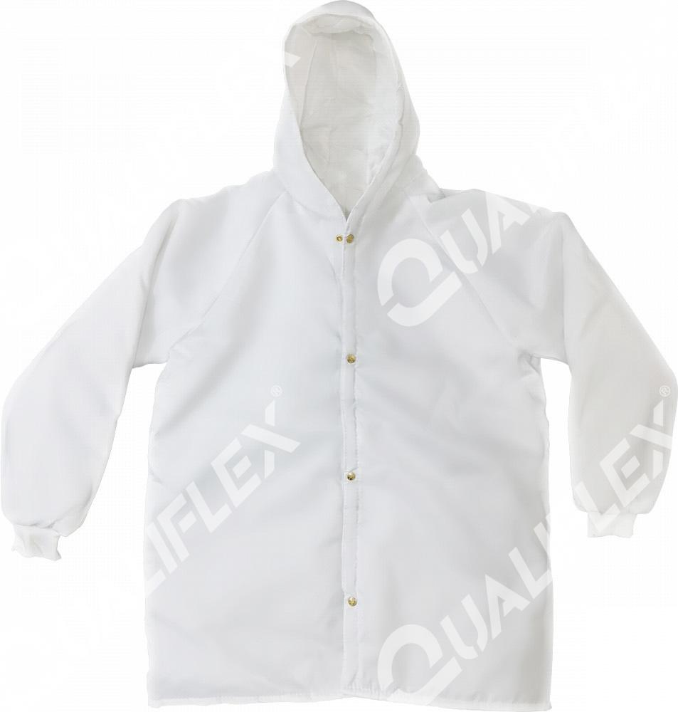 Japona térmica confeccionada em nylon resinado, manta térmica interna de poliéster de 150g/m², capuz acoplado sem cordão, sem bolsos, acabamento externo liso, acabamento interno matelado, fechamento frontal com 4 botões de pressão de ferro niquelado guiados por tira contínua de velcro 25mm.