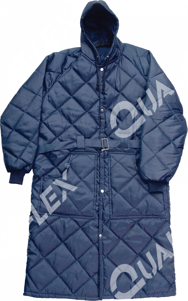 Sobretudo térmico confeccionado em nylon resinado, manta térmica interna de poliéster de 200g/m², capuz acoplado com ajuste por cordão, bolsos frontais, sem cinta*, acabamento externo e interno matelado (costurado), fechamento frontal por botões de pressão de latão guiados por velcro.