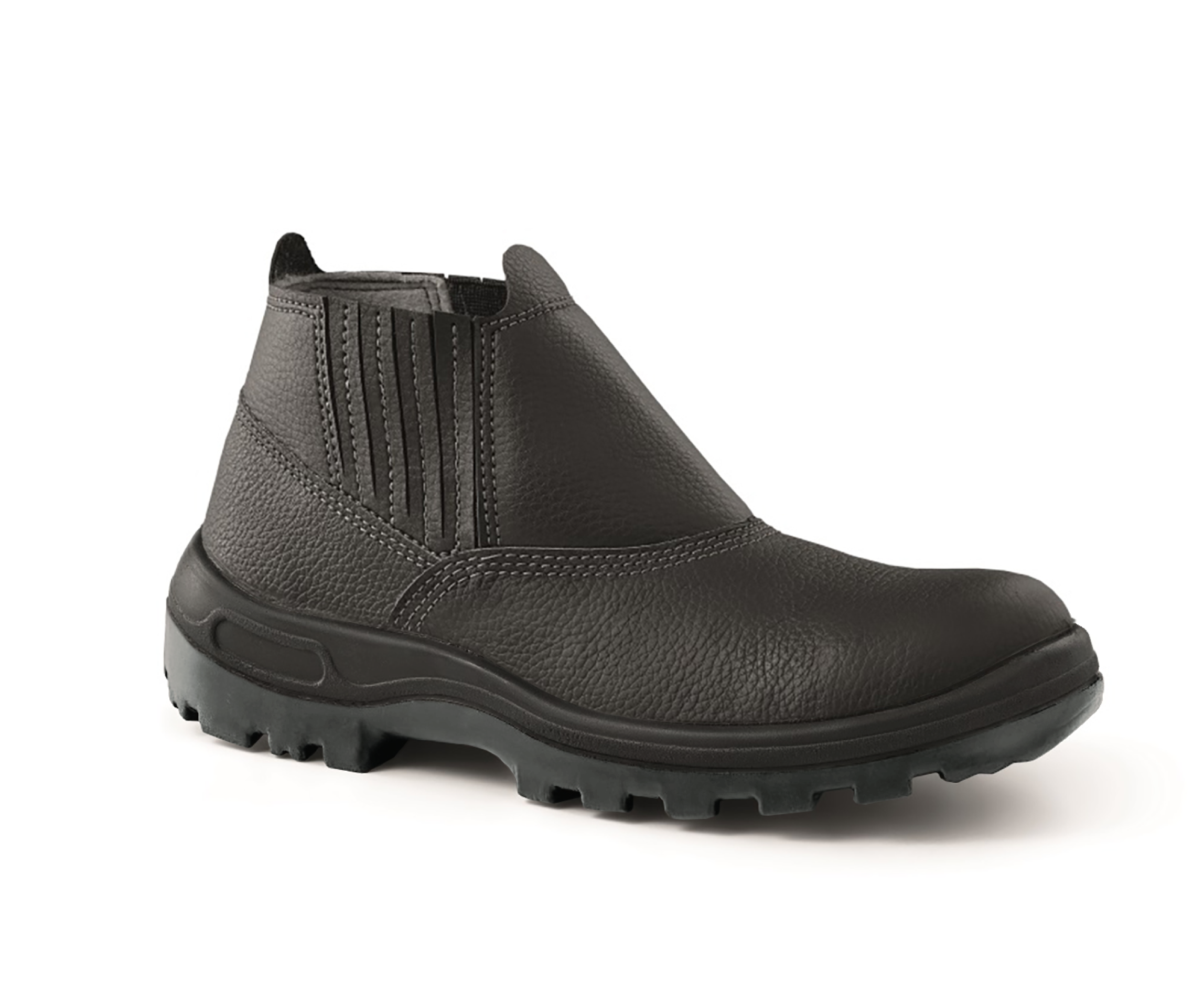 Botina de segurança confeccionada em microfibra na cor preta, solado de poliuretano (PU) bidensidade injetado diretamente no cabedal, biqueira de composite resistente a impactos e não condutiva de eletricidade, fechamento através de elástico nas laterais.