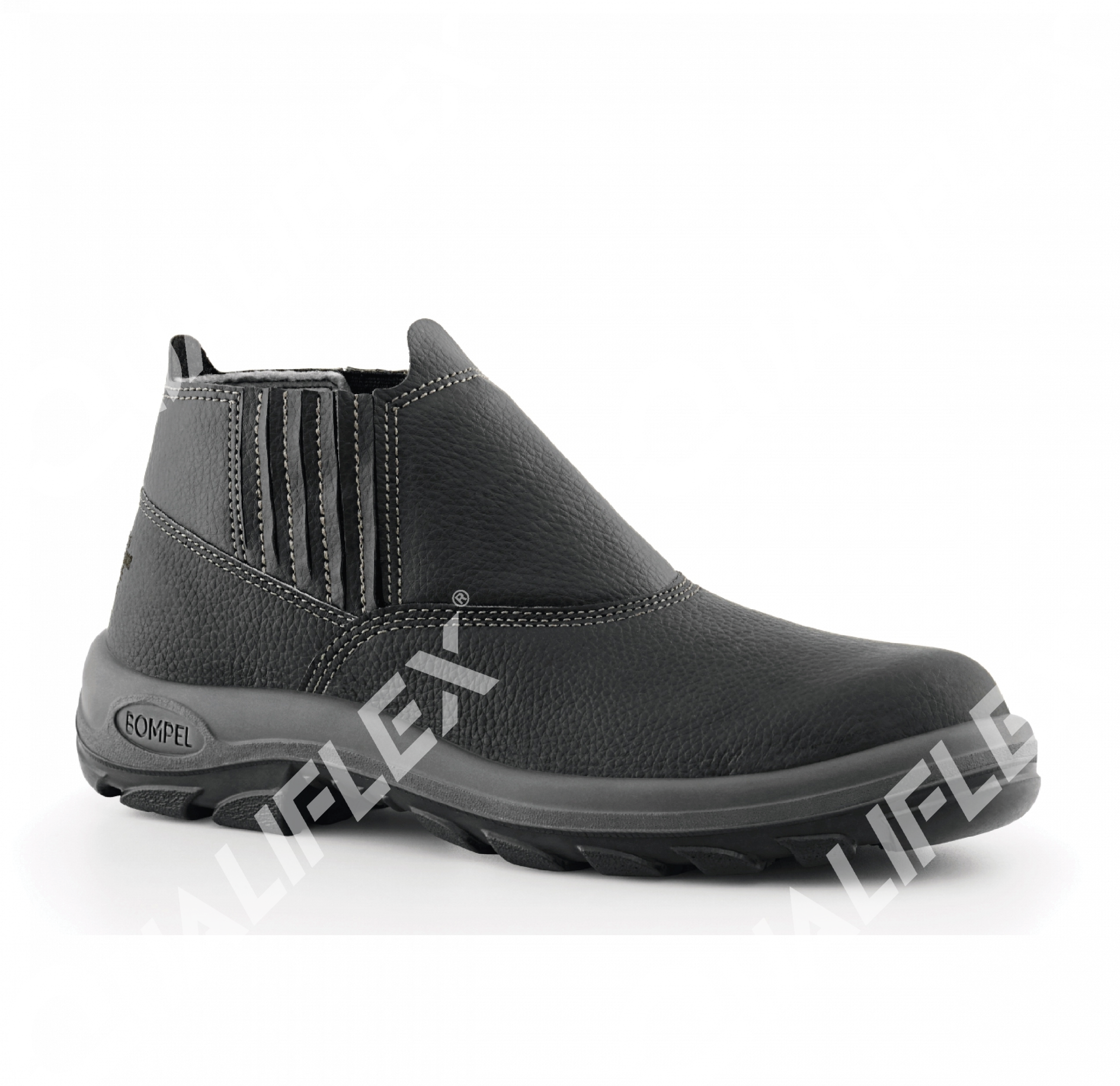 Botina de proteção fabricada em couro tipo vaqueta hidrofugada, solado de poliuretano (PU) bidensidade injetado diretamente no cabedal, biqueira de composite resistente a impactos e não condutiva de eletricidade, fechamento através de elástico nas laterais.