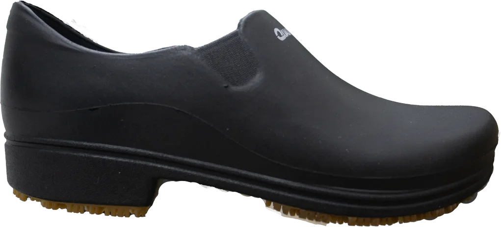 Sapato antiderrapante de uso profissional confeccionado à base de TPE (Elastômero/Borracha Termoplástica), com alta resistência à rasgamento, tração, flexão, contra risco de escorregamento e à sujidade (não encarde).