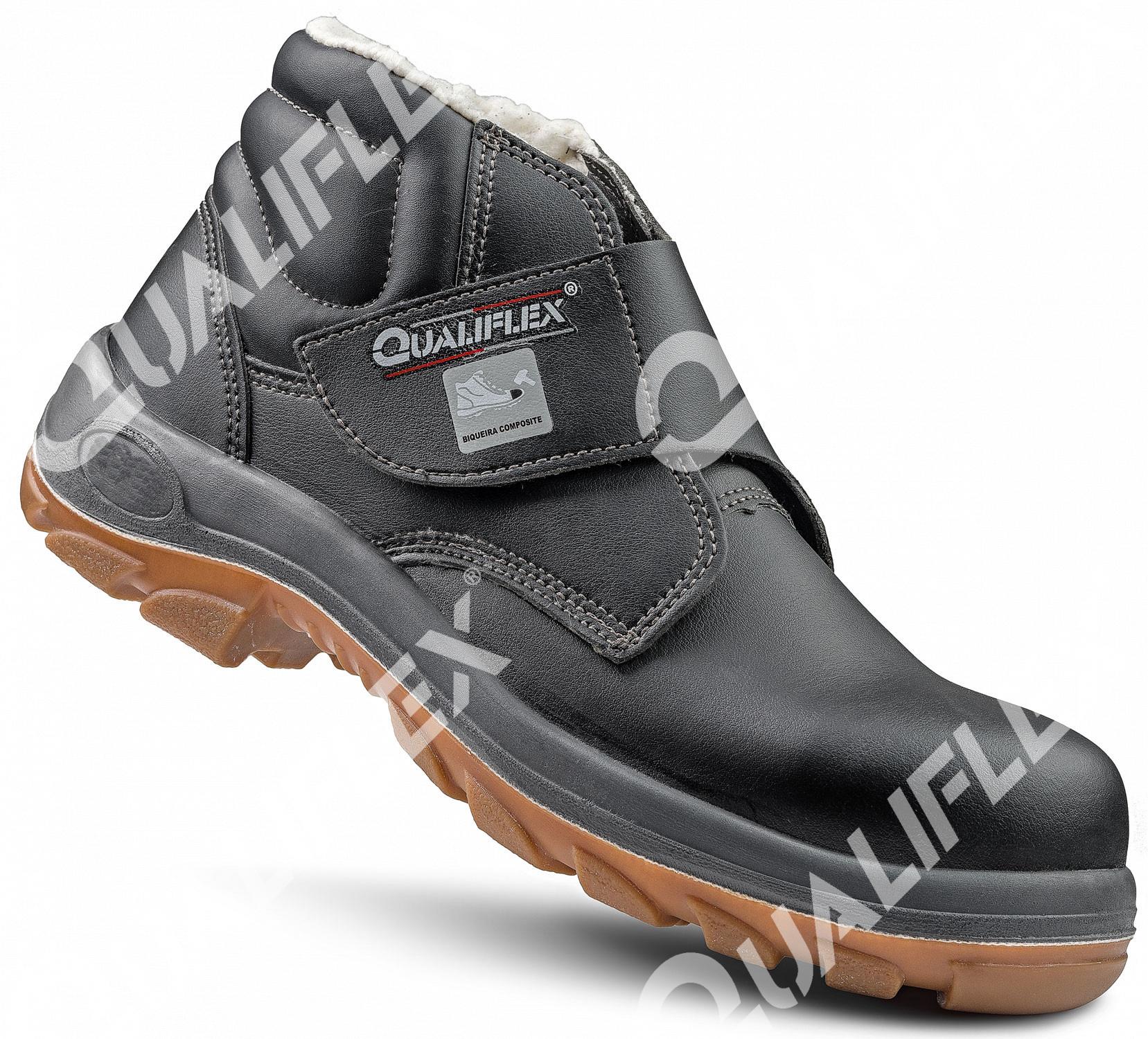 Botina de segurança confeccionada em microfibra na cor preta , cano baixo, fechamento através de tira transversal de velcro, forrado internamente com lã sintética para baixas temperaturas, biqueira de composite, solado bicomponente de látex natural e poliuretano (PU) injetado diretamente no cabedal.