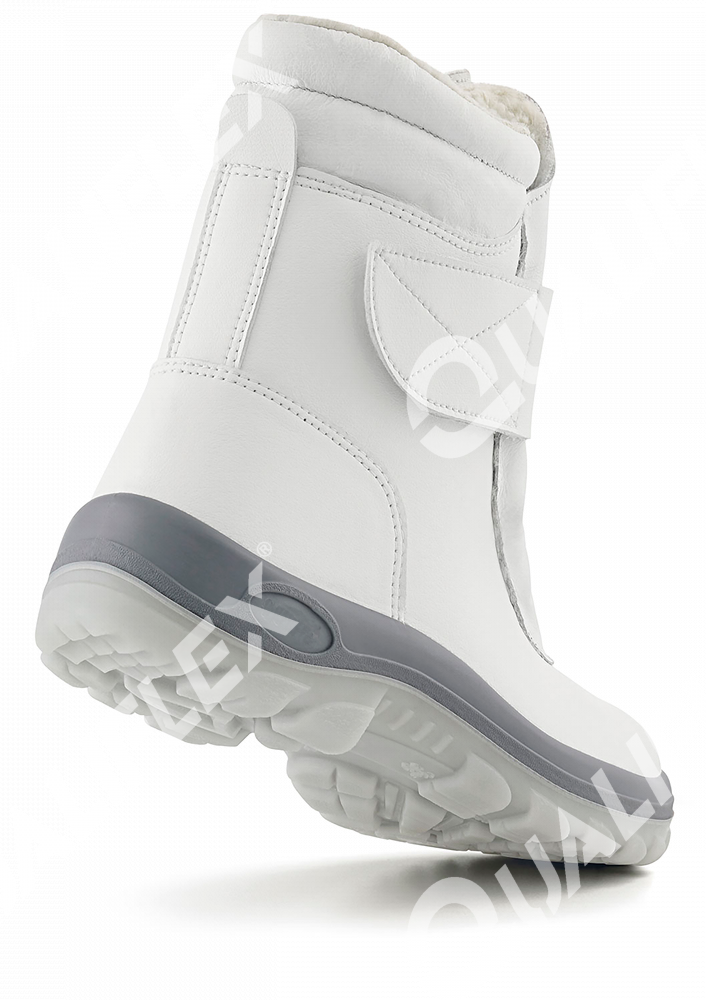 Coturno de segurança confeccionado em microfibra na cor branca, fechamento através de tira horizontal de velcro, forrado internamente com lã sintética para baixas temperaturas, biqueira de composite, solado de poliuretano (PU) bidensidade injetado diretamente no cabedal.