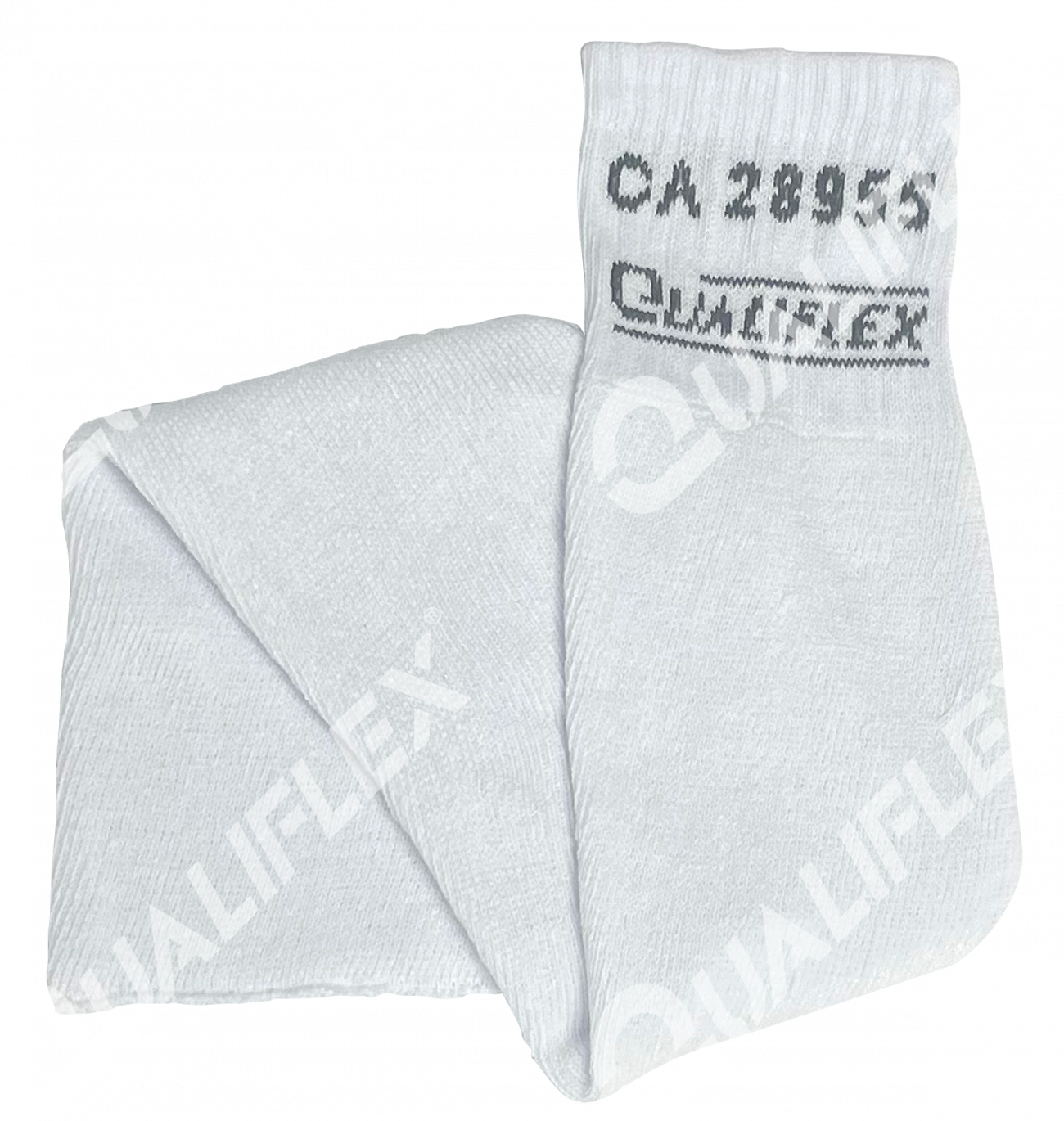 Meião térmico confeccionado em algodão branco, cano longo (comprimento total de 60cm), ajuste na região do calcanhar para melhor encaixe nos pés. CA gravado diretamente na malha.